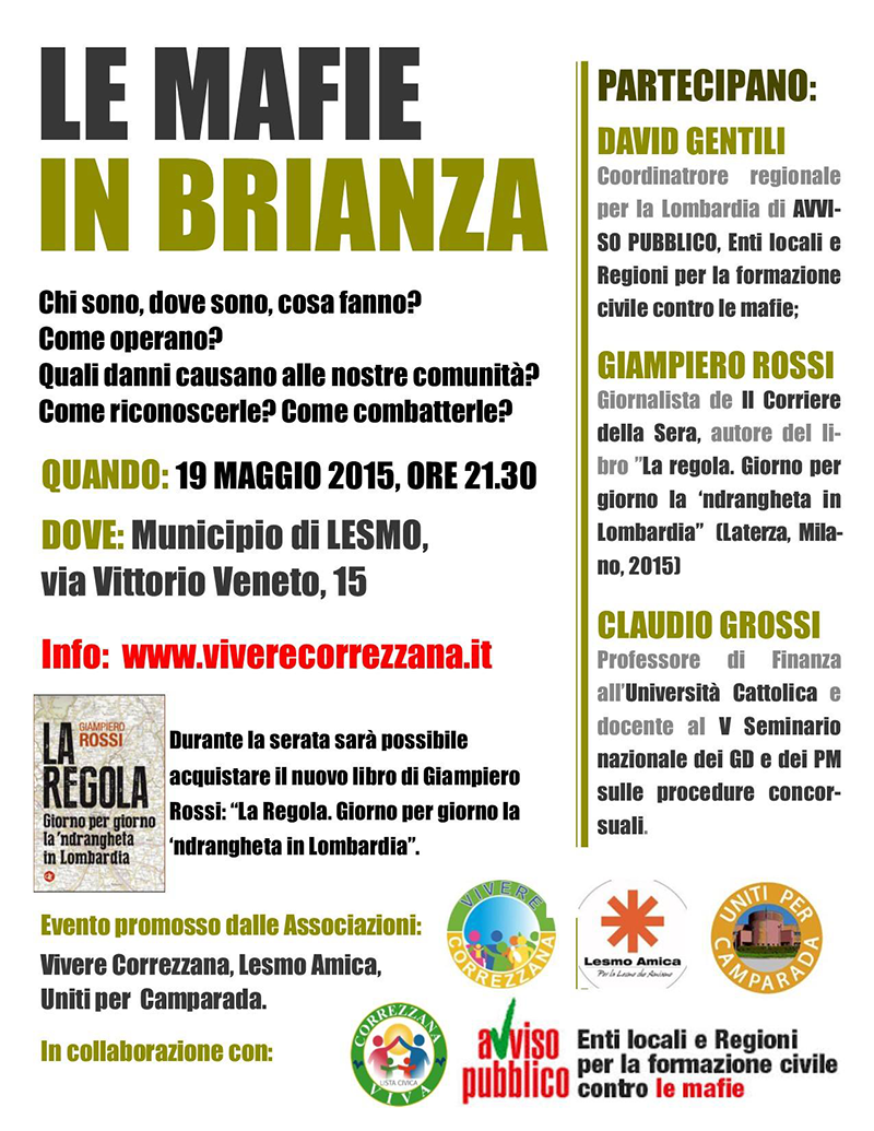 Ne parleremo con Giampiero Rossi, giornalista de “Il Corriere della Sera” e autore del testo “La regola. Giorno per giorno la ‘ndrangheta in Lombardia”; Claudio Mario Grossi, professore di Finanza all’Università Cattolica di Milano e Piacenza; David Gentili, coordinatore per la Lombardia di Avviso Pubblico (Enti locali e Regioni per la formazione civile contro le mafie).