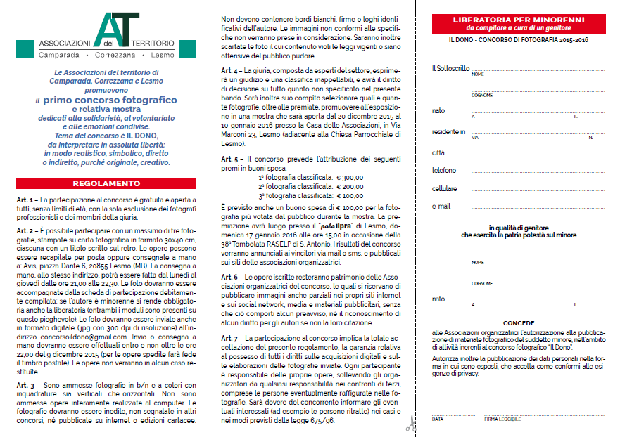 Vivere Correzzana e le Associazioni del territorio di Camparada, Correzzana e Lesmo promuovono il primo concorso fotografico e relativa mostra dedicati alla solidarietà, al volontariato e alle emozioni condivise. Tema del concorso è IL DONO, da interpretare in assoluta libertà: