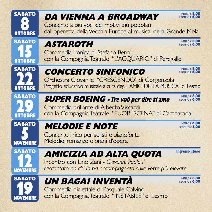 - Teatro Piccolo di Lesmo – prezzo ridotto sull’intera Stagione teatrale in corso, per prenotazioni tel. 039 698 0937